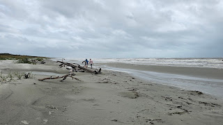 Its nice to have adventurous friends who are willing to follow and assist in sea turtle activities such as performing an inventory of a nest while the ocean is angry and the wind was picking up on the beach. Thankfully, both Kim T and Kim Pf have those credentials and were available to investigate going out to the island. Thankfully, the Causeway was clear and had not been flooded. The beach access road after the CCU gate was partially under water in places, but still passable. We were able to drive over the dunes to the beach. With the tide coming in, I parked my truck on the beach road.